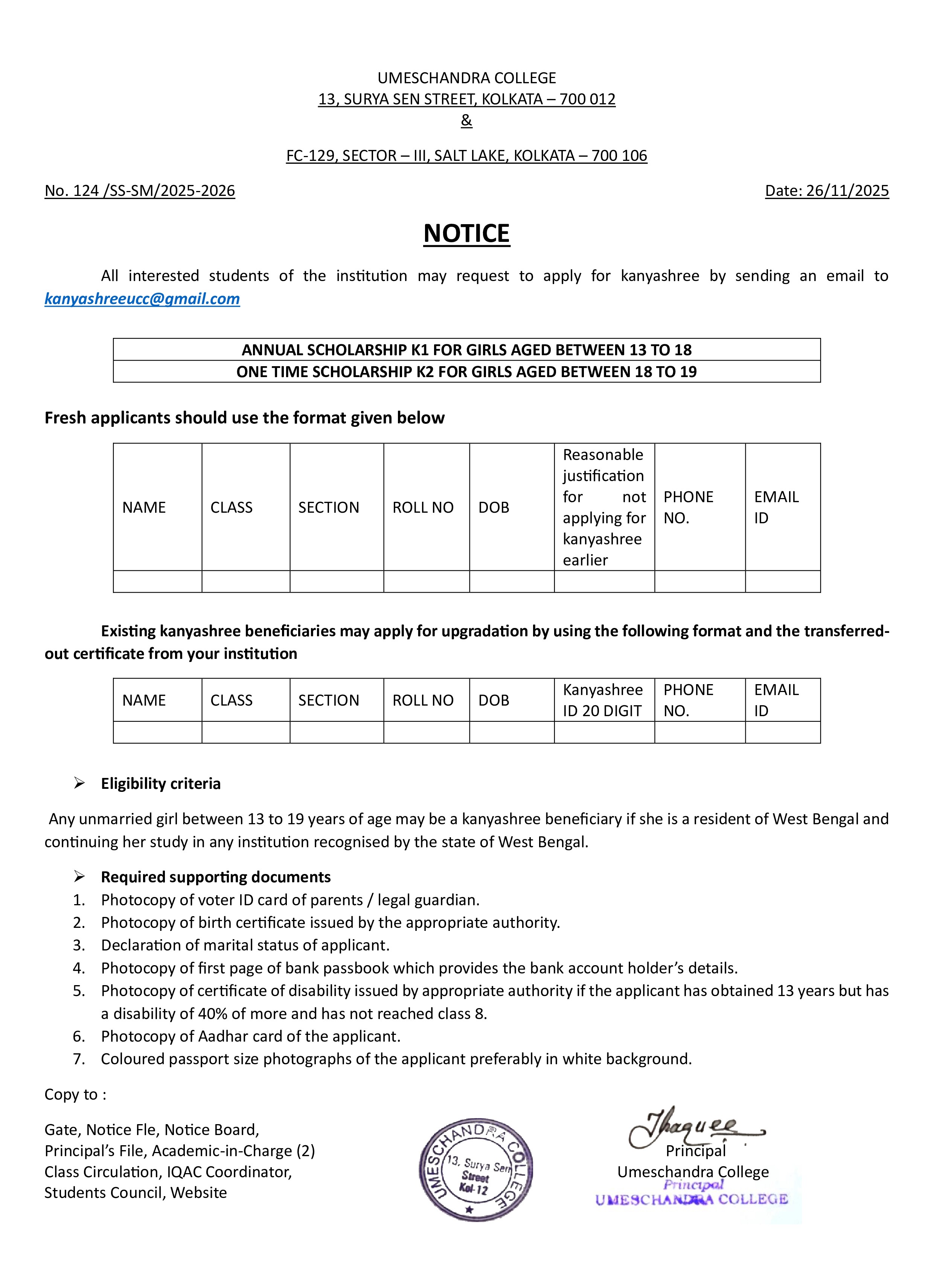 News : NOTICE FOR GIRLS STUDENTS REGARDING KANYASHREE
