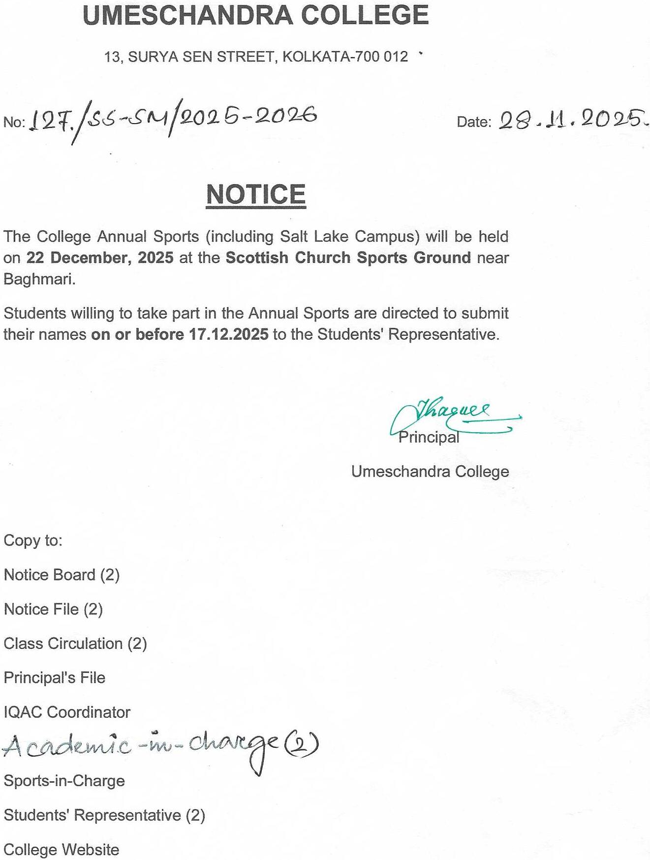 News : NOTICE FOR COLLEGE ANNUAL SPORTS WILL BE HELD ON 22 DECEMBER,2025 AT SCOTTIS CHURCH SPORTS GROUND.