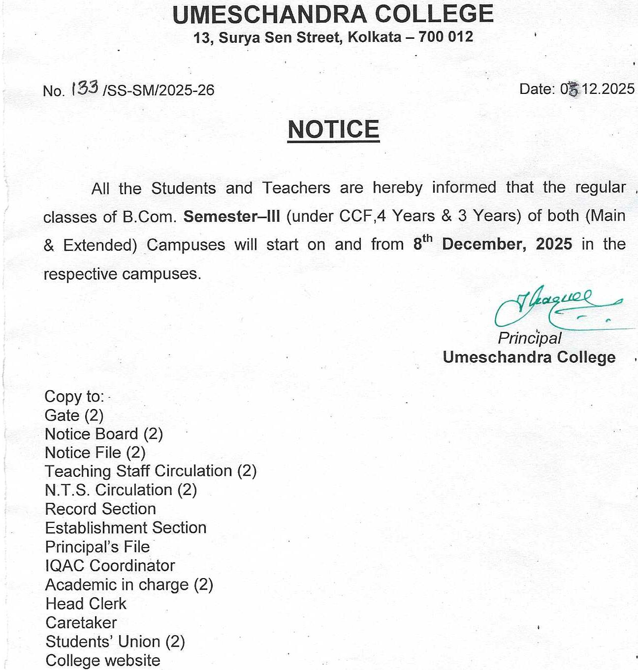 News : NOTICE FOR B.COM SEMESTER-III(UNDER CCF,4YEAR & 3YEAR) THE REGULAR CLASSES WILL BE START ON AND FROM 8th DECEMBER,2025 IN RESPECTIVE CAMPUS.(MAIN &EXTENDED)