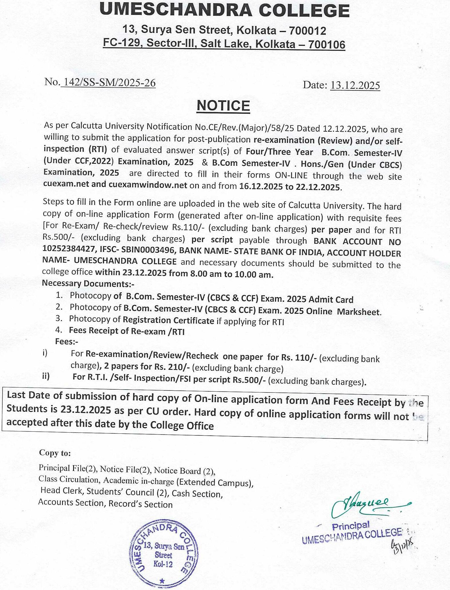 News : NOTICE FOR RE-EXAMINATION(REVIEW) AND OR SELF-INSPECTION(RTI) B.COM SEMESTER-IV. HONS.& GEN.(UNDER CBCS & UNDER CCF,2022)EXAMINATION 2025.