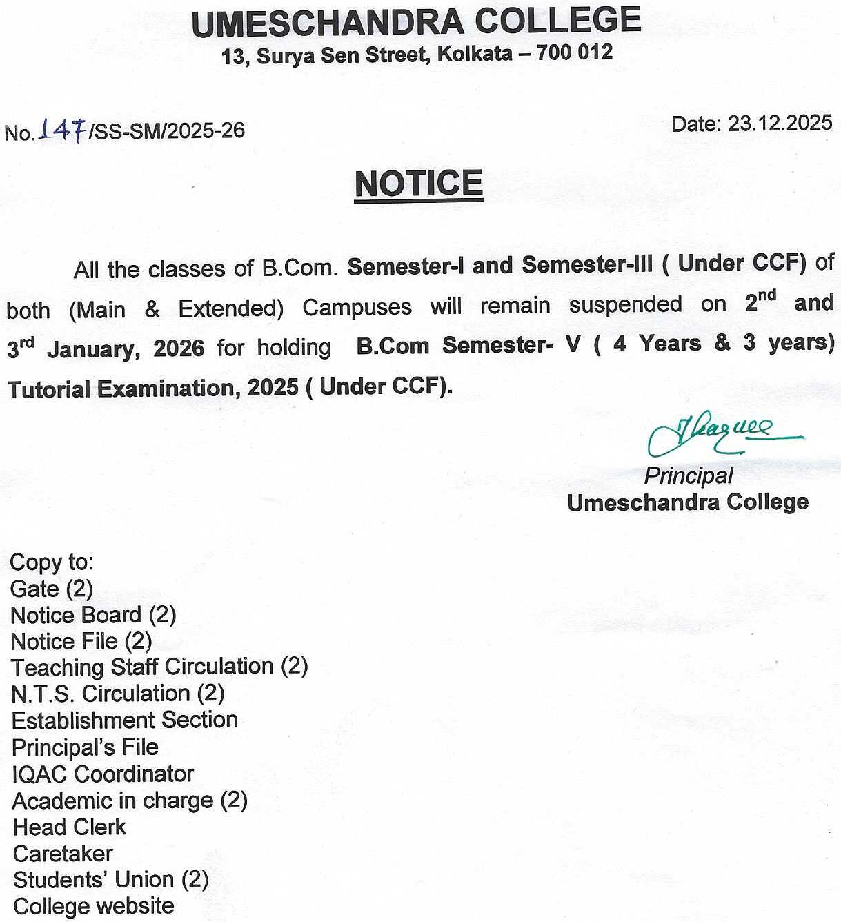 News : ALL THE CLASSES SUSPENDED OF B.COM. SEMESTER-I & III(UNDER CCF) OF BOTH CAMPUS.