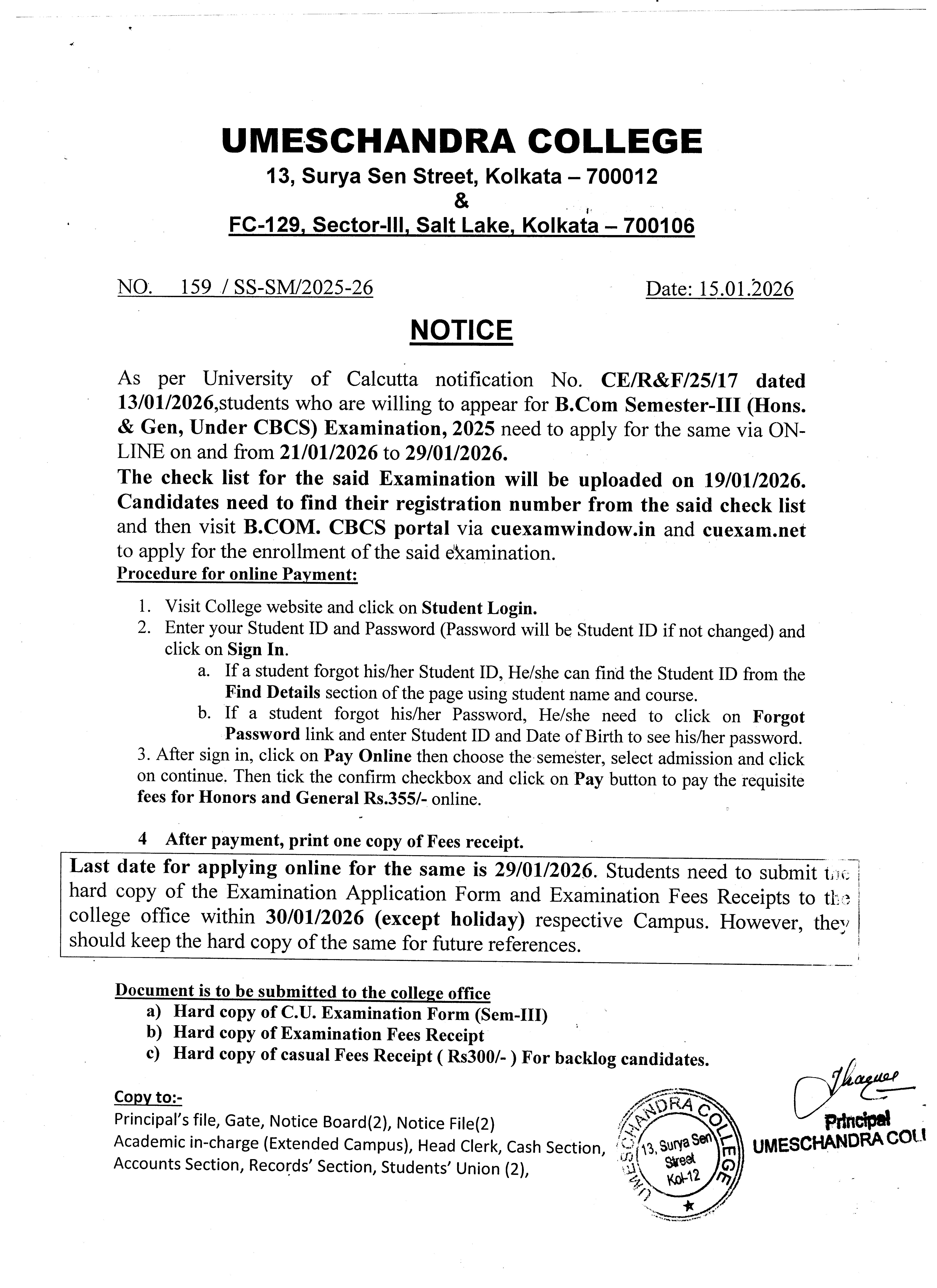News : As per University of Calcutta notification no. CE/R&F/25/17 dated 13/01/2026, an extension of the system of online submission of forms for Four/Three-Year B. Com Semester-III Examination, 2025 (under CBCS) need to apply for the same via ON-LINE on and form 21/01/2026 to 29/01/2026.