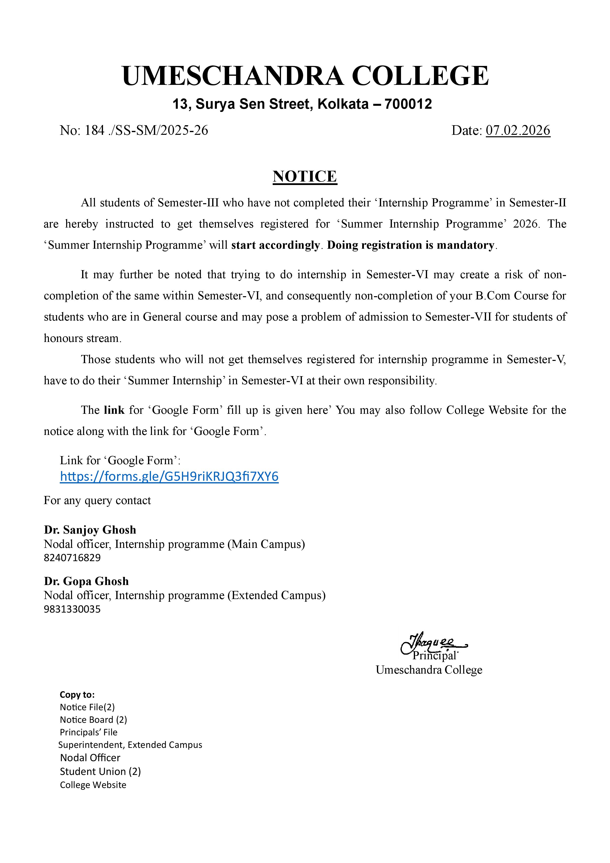 News : All students of Semester-III who have not completed their ‘Internship Programme’ in Semester-II are hereby instructed to get themselves registered for ‘Summer Internship Programme’ 2026.