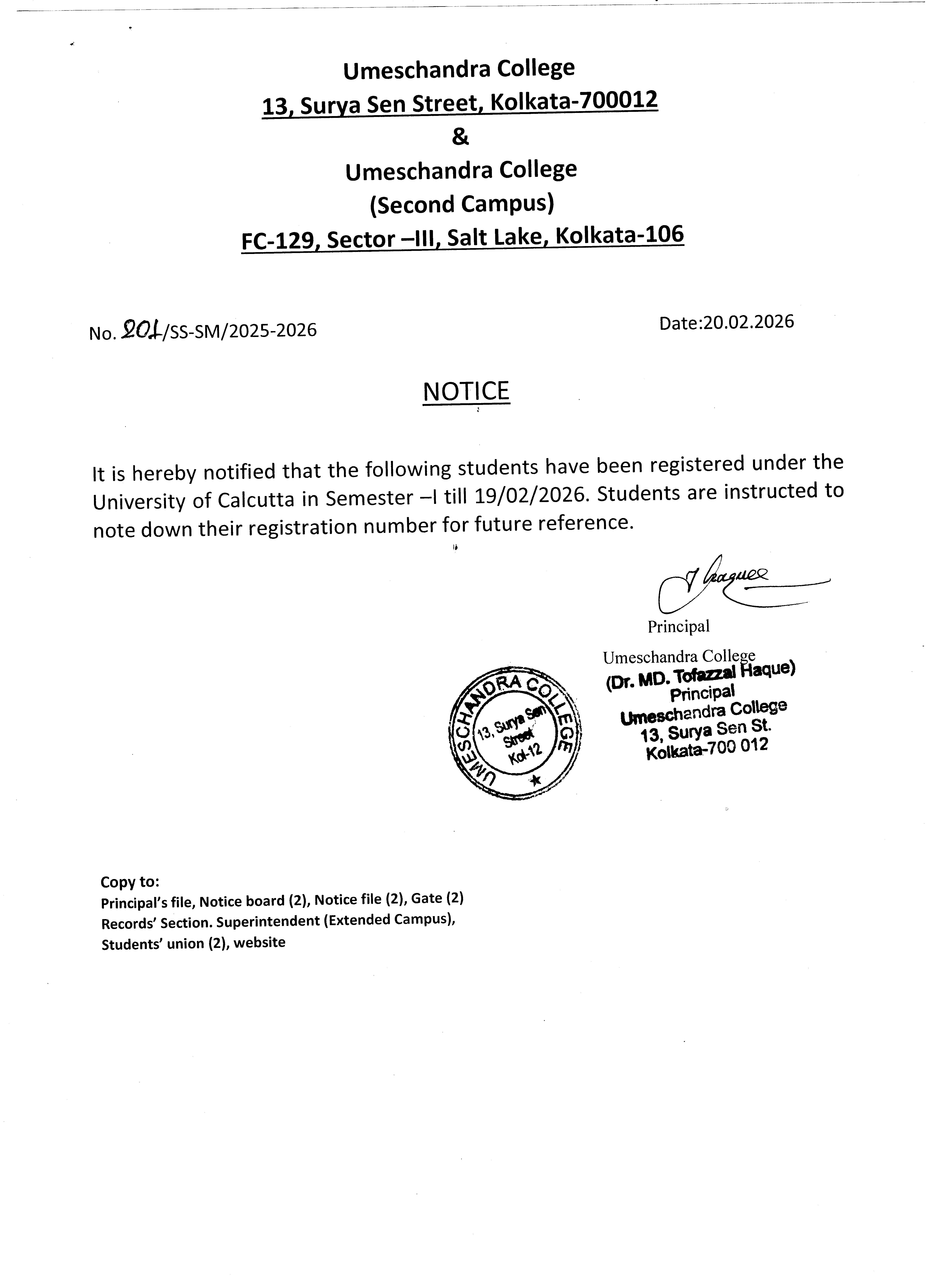 News : Updated notice: Semester-I students are instructed to note down their registration number
