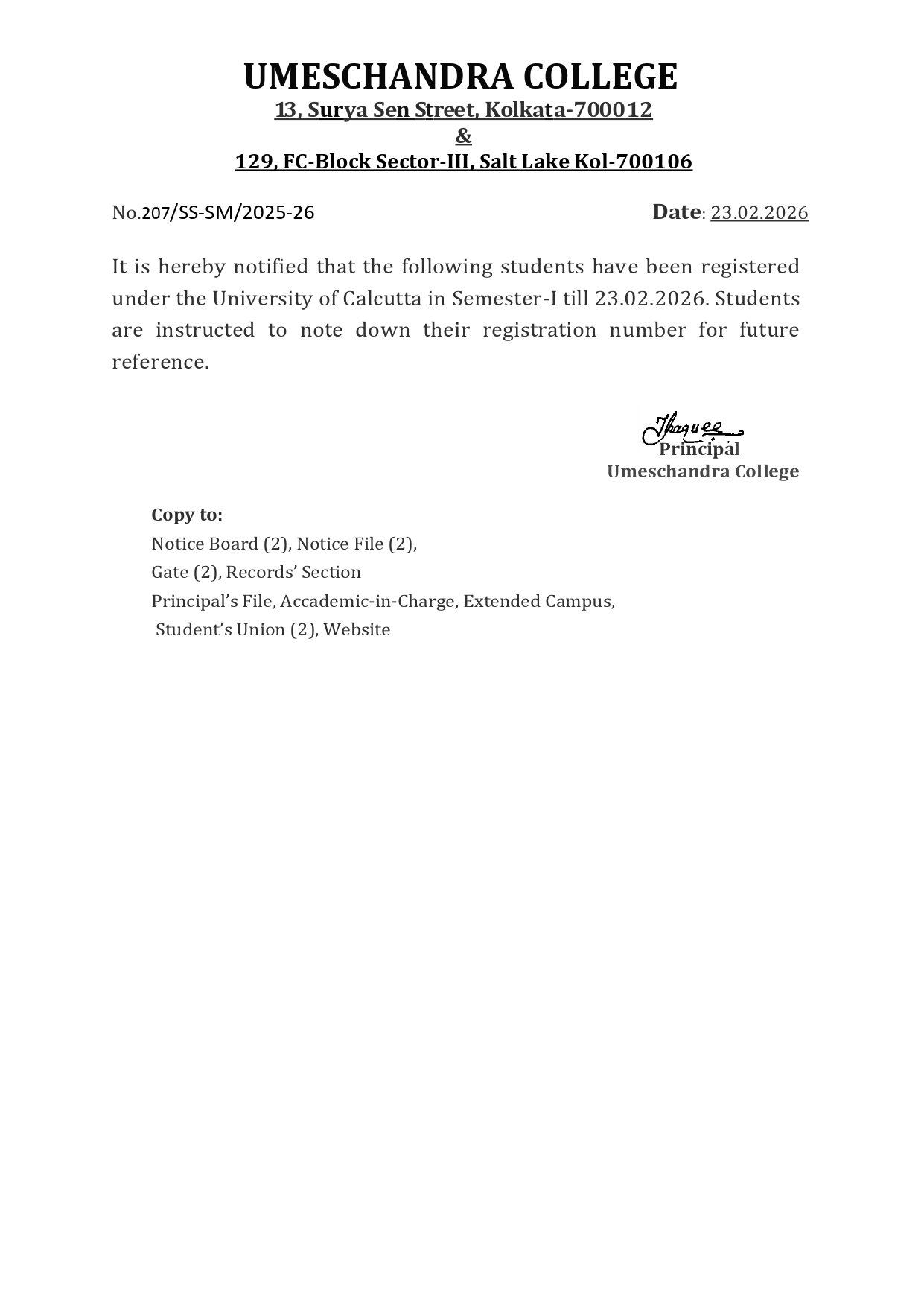 News : Updated notice: Semester-I students are instructed to note down their registration number