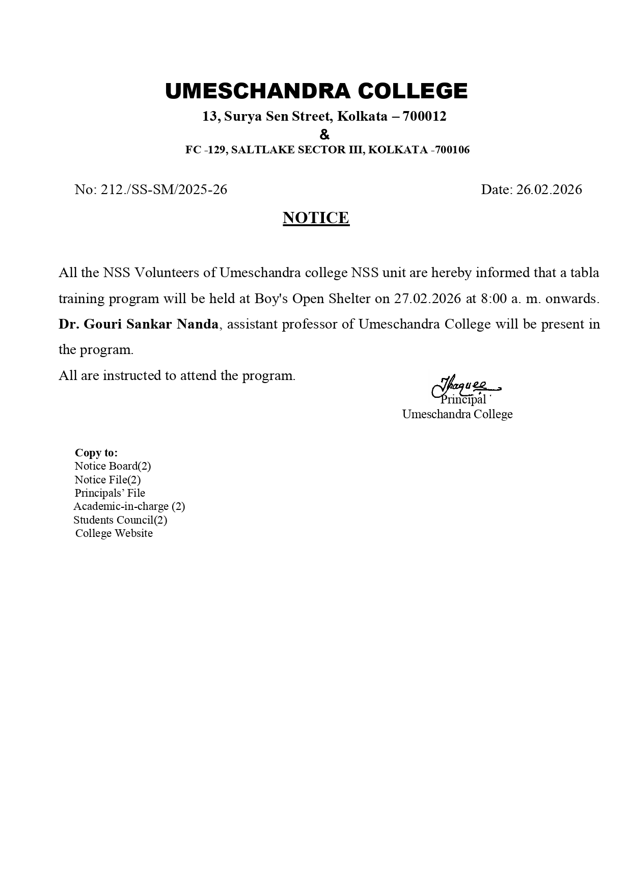 News : A tabla training program will be held at Boy's Open Shelter on 27.02.2026