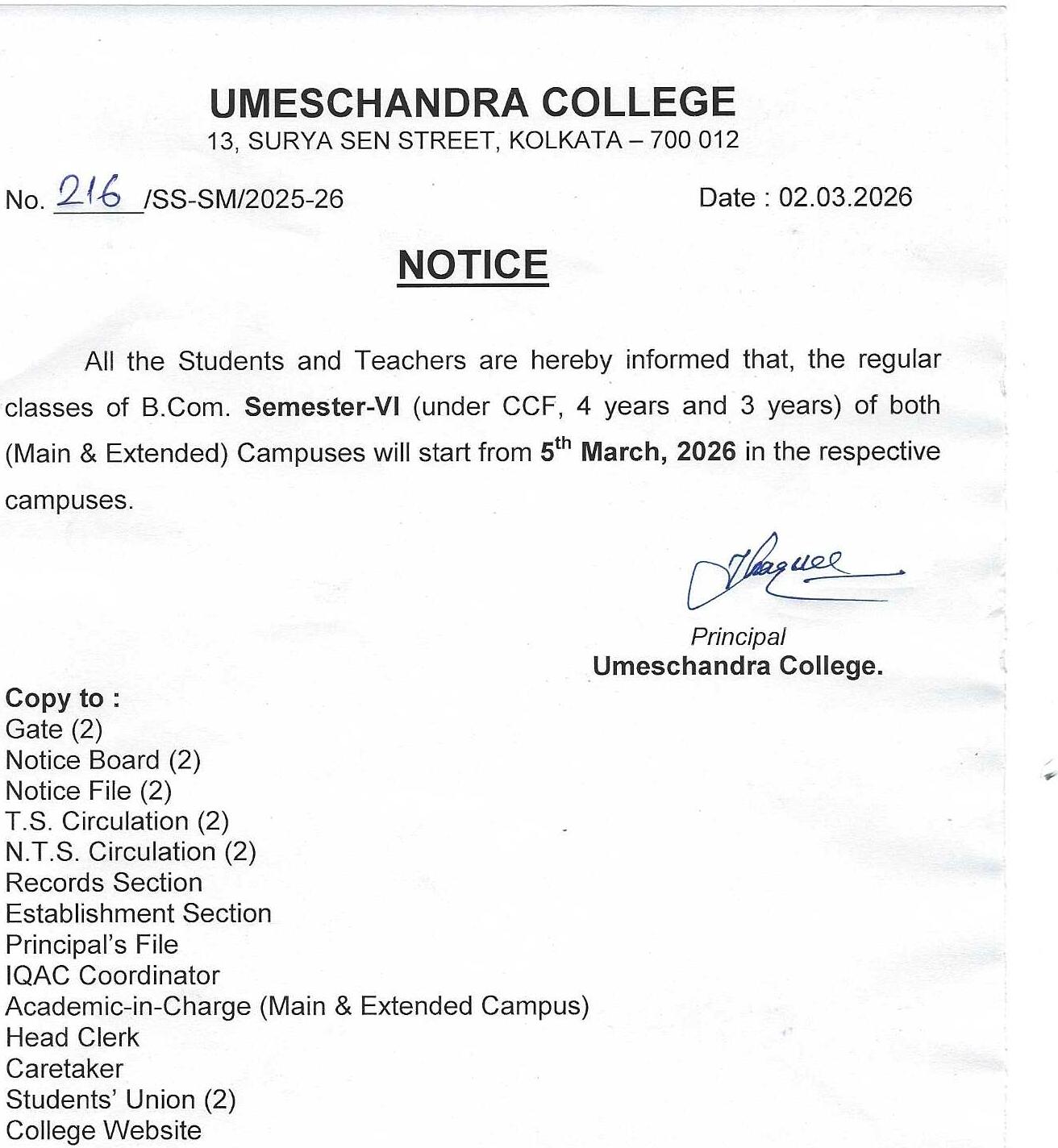 News : NOTICE FOR SEMESTER-VI( FOUR/THREE YEAR B.COM.UNDER CCF) STUDENTS REGULAR CLASSES OF BOTH CAMPUS.