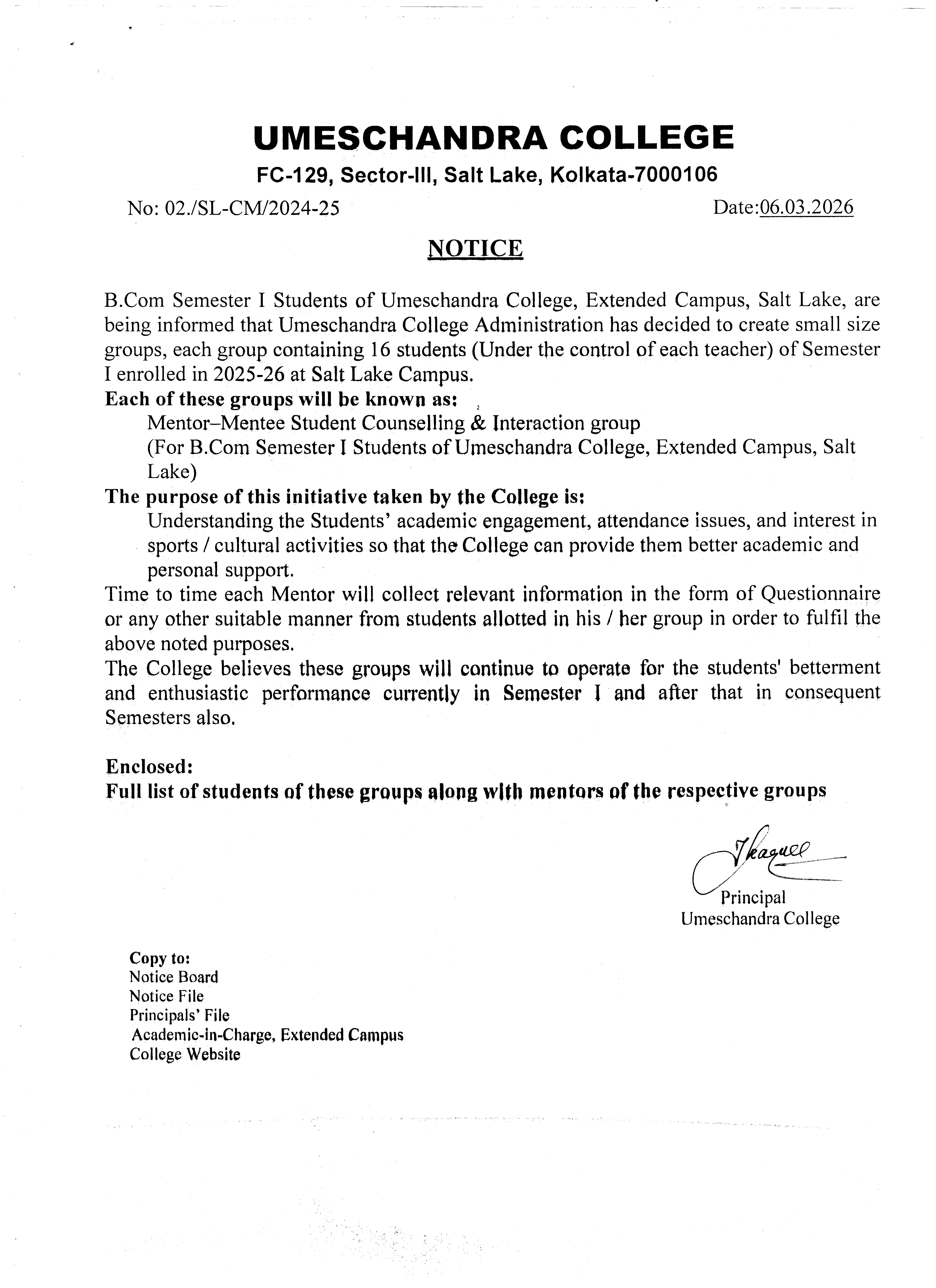 News : Umeschandra College Administration has decided to create small size groups, each group containing 16 students of Semester-I