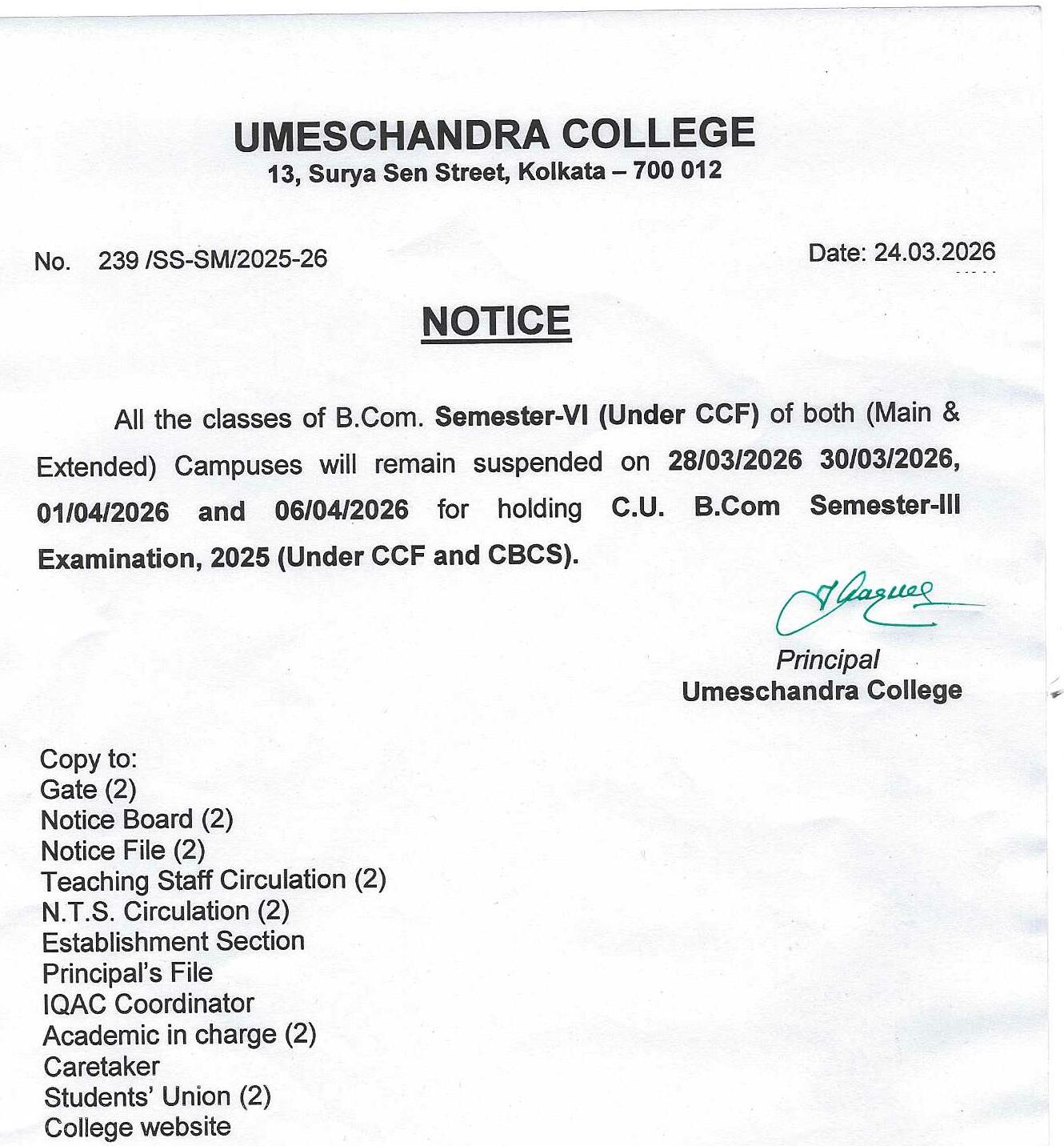 News : ALL CLASSES OF B.COM SEMESTER-VI (UNDER CCF) OF BOTH CAMPUS WILL REMAIN SUSPENDED.