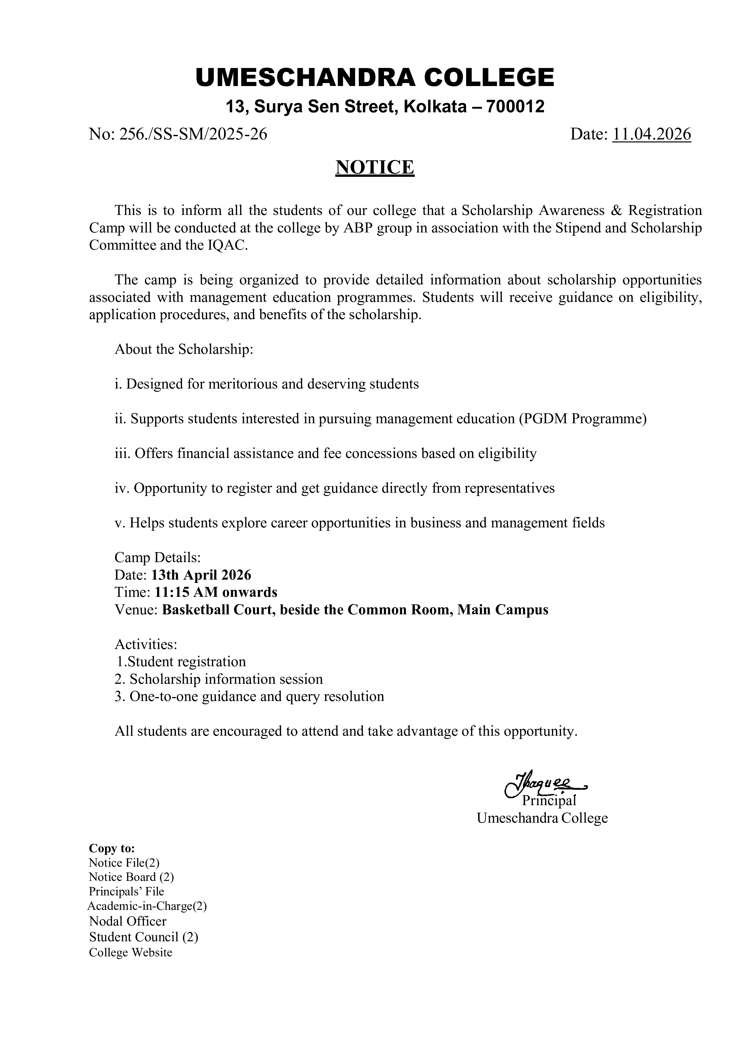 News : This is to inform all the students of our college that a Scholarship Awareness & Registration Camp will be conducted at the college by ABP group in association with the Stipend and Scholarship Committee and the IQAC.