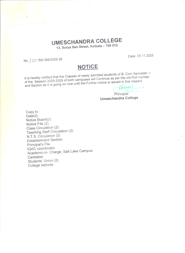 News : CLASSES OF B.COM SEMESTER-I NEWLY ADMITTED STUDENTS SESSION-2025-26 OF BOTH THE CAMPUSES WILL BE CONTINUED AS PER OLD ROLL NO