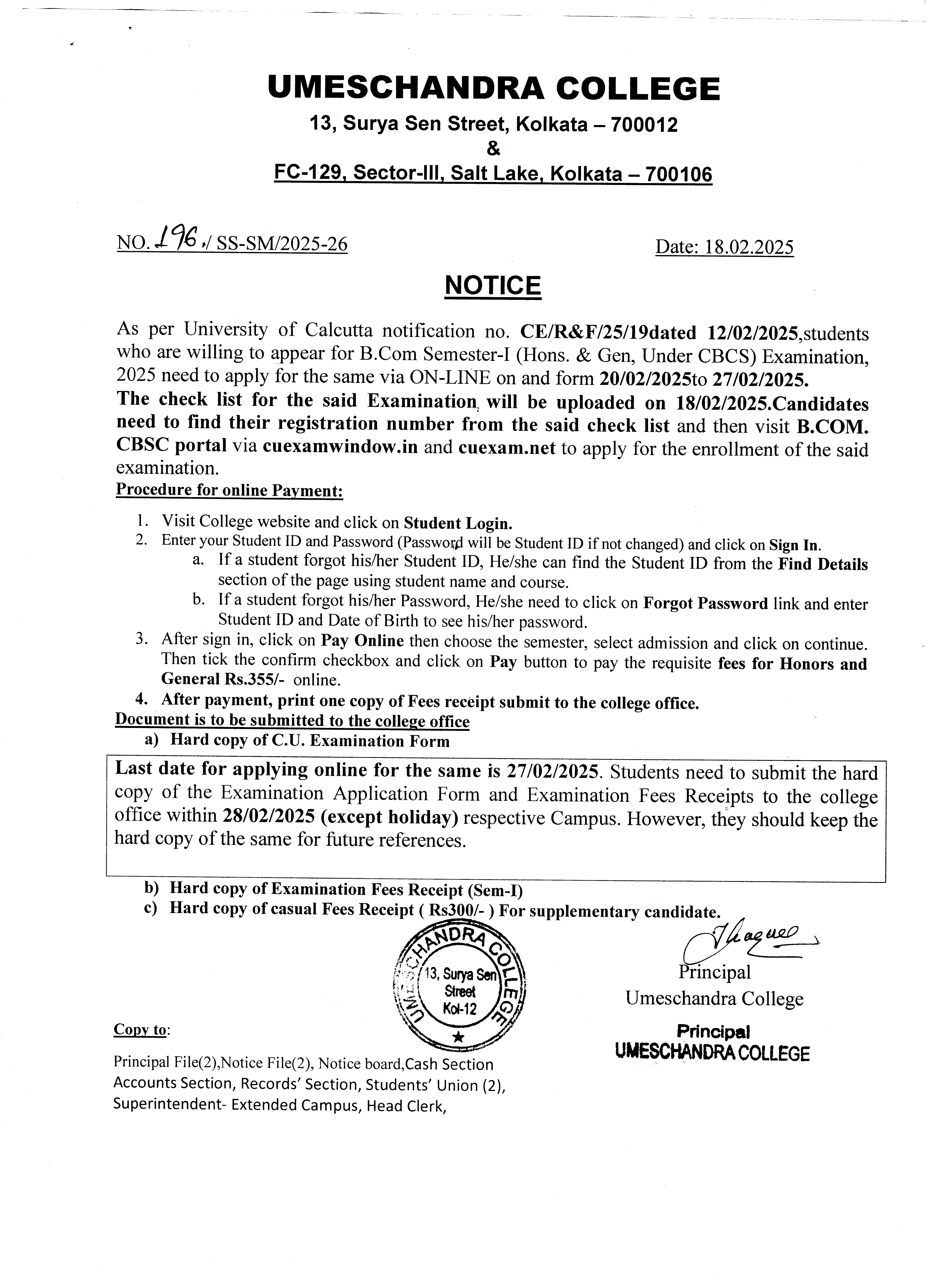 News : THE SYSTEM OF ONLINE SUBMISSION OF EXAMINATION FORM FOR B.COM SEMESTER-II (HONS./GEN, UNDER CBCS) EXAMINATION-2025