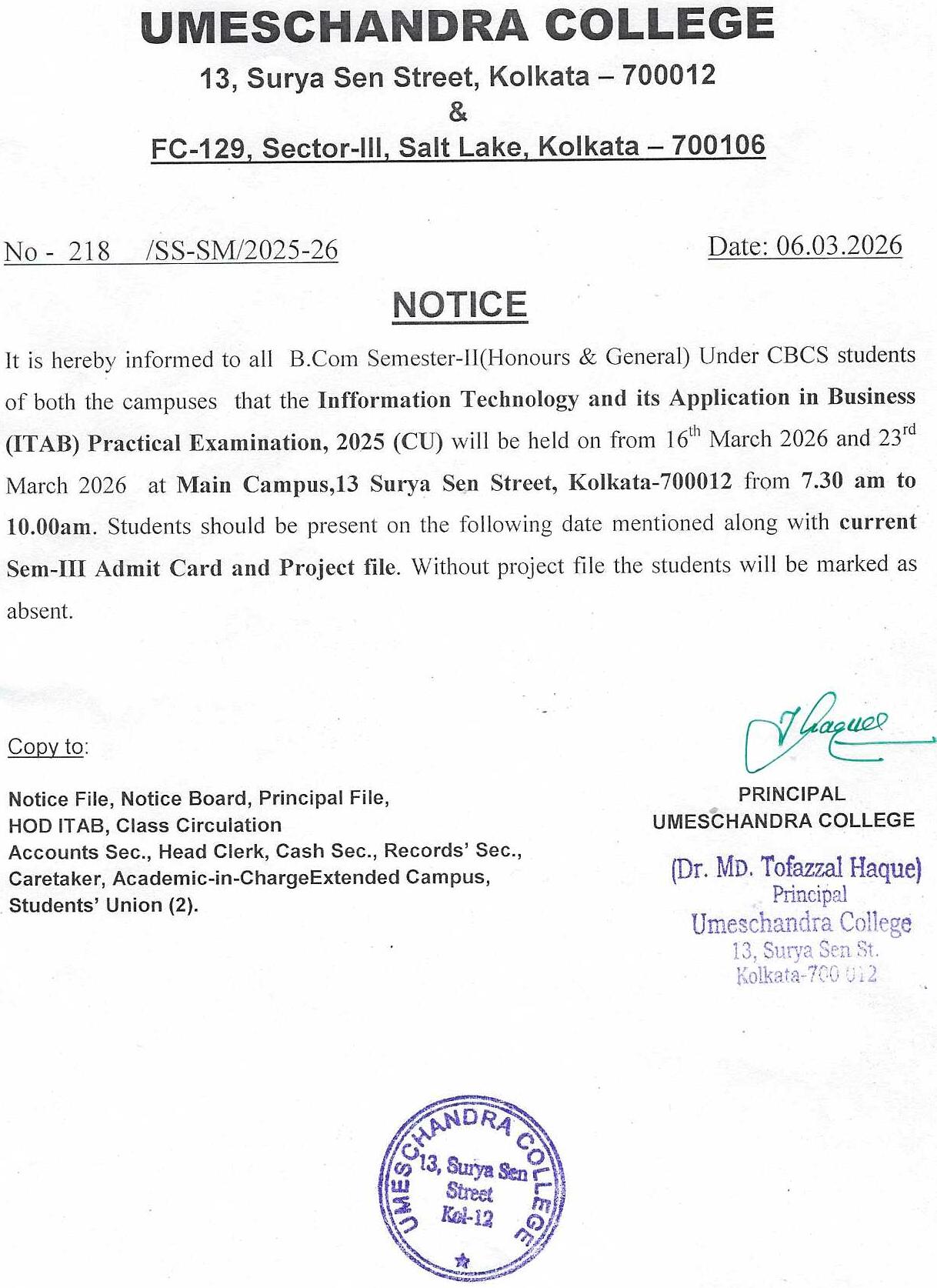 News : NOTICE FOR C.U. ITAB PRACTICAL EXAMINATION, 2025, OF B.COM. SEMESTER-II(HONS.& GEN.) UNDER CBCS STUDENTS OF BOTH CAMPUSES.